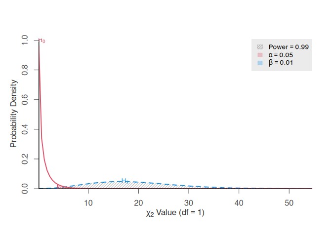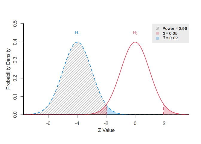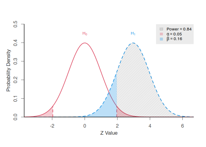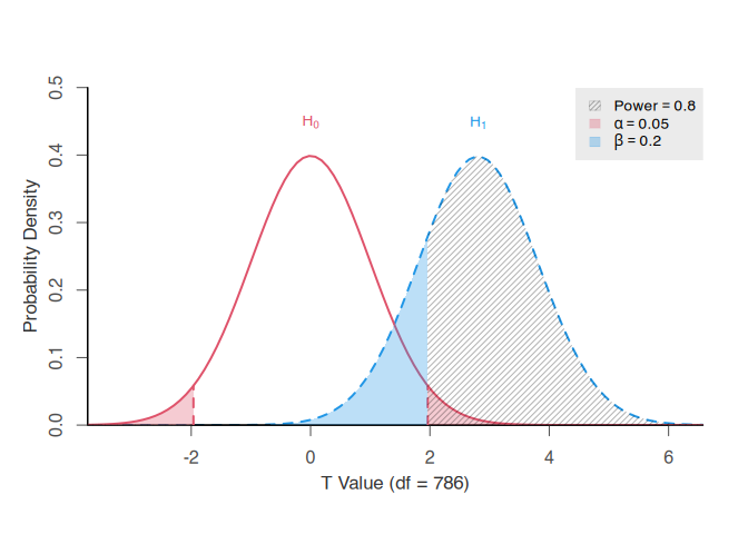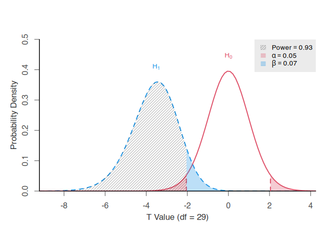 Power calculations can be performed by entering the test statistic through the ncp or mean arguments. Post-hoc power estimates derived this way provide a sensitivity analysis, revealing the evidential strength of a study’s sample size relative to the observed effect size. This approach offers valuable insights for large samples, where effect estimates demonstrate greater stability. However, for small samples, where effect size estimates exhibit higher variability, post-hoc power requires cautious interpretation.